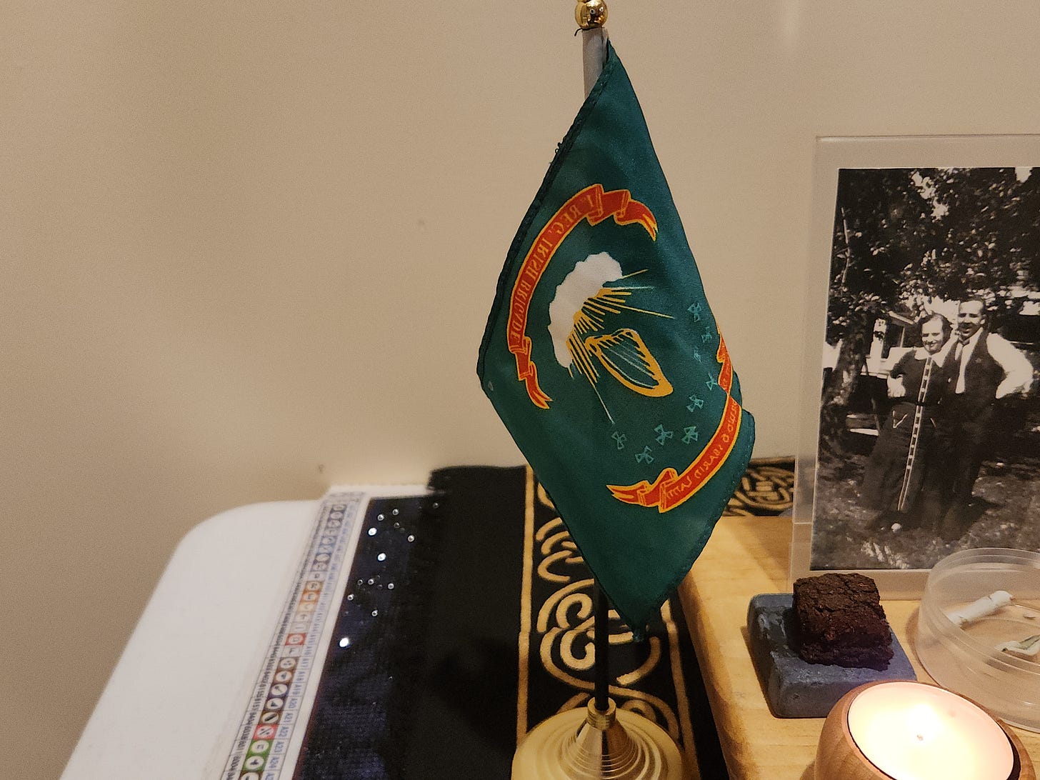 I feel a powerful connection to my great, great-grandfather. Since there are no known photos of him, he is represented on my altar by his Regiment’s flag.