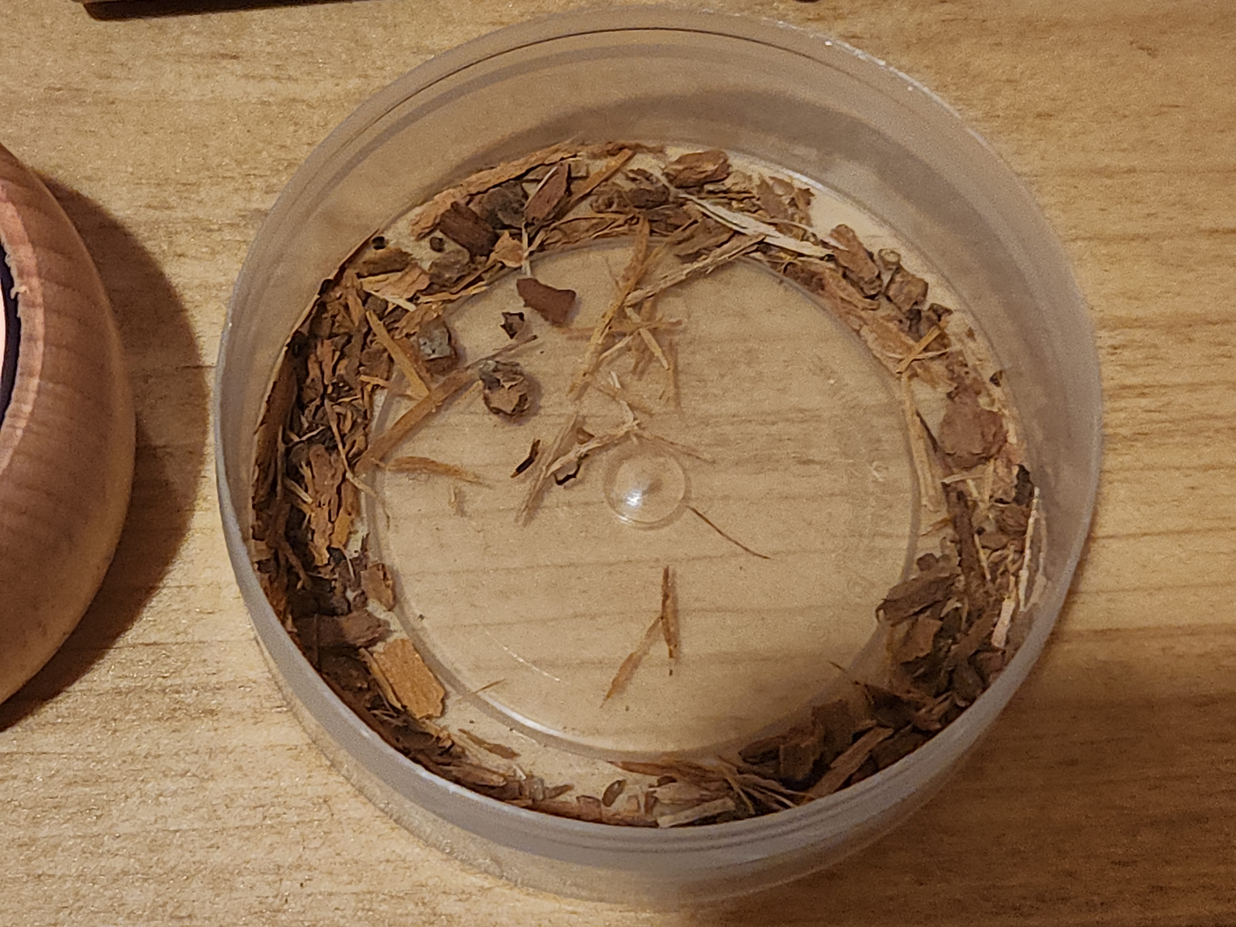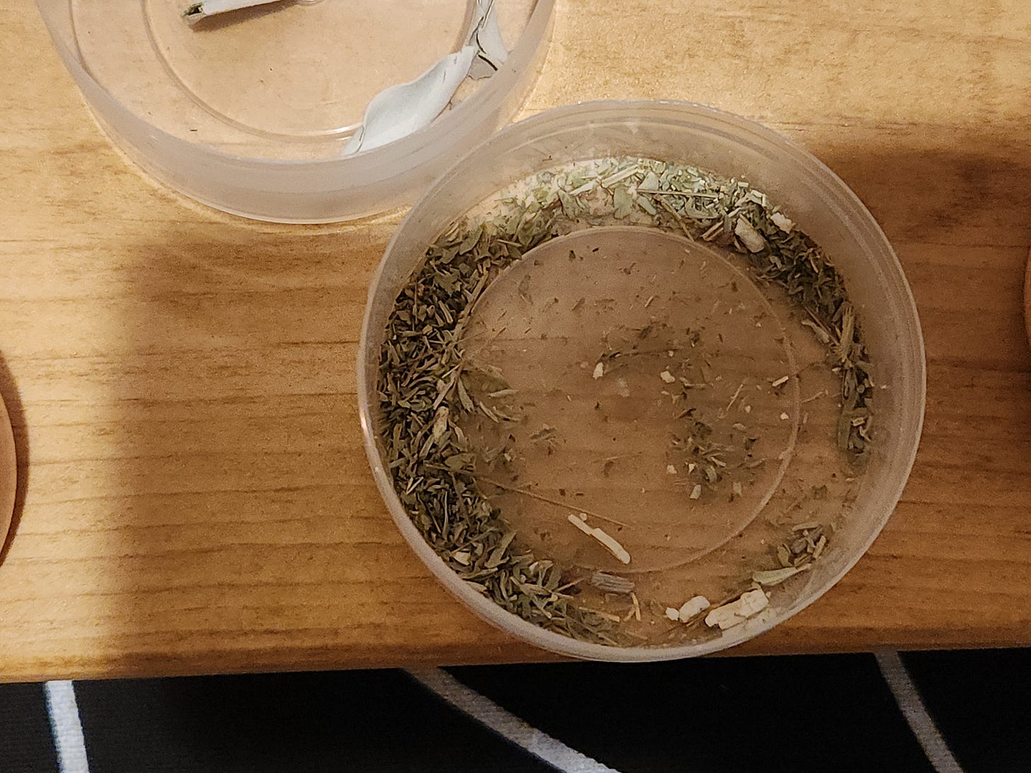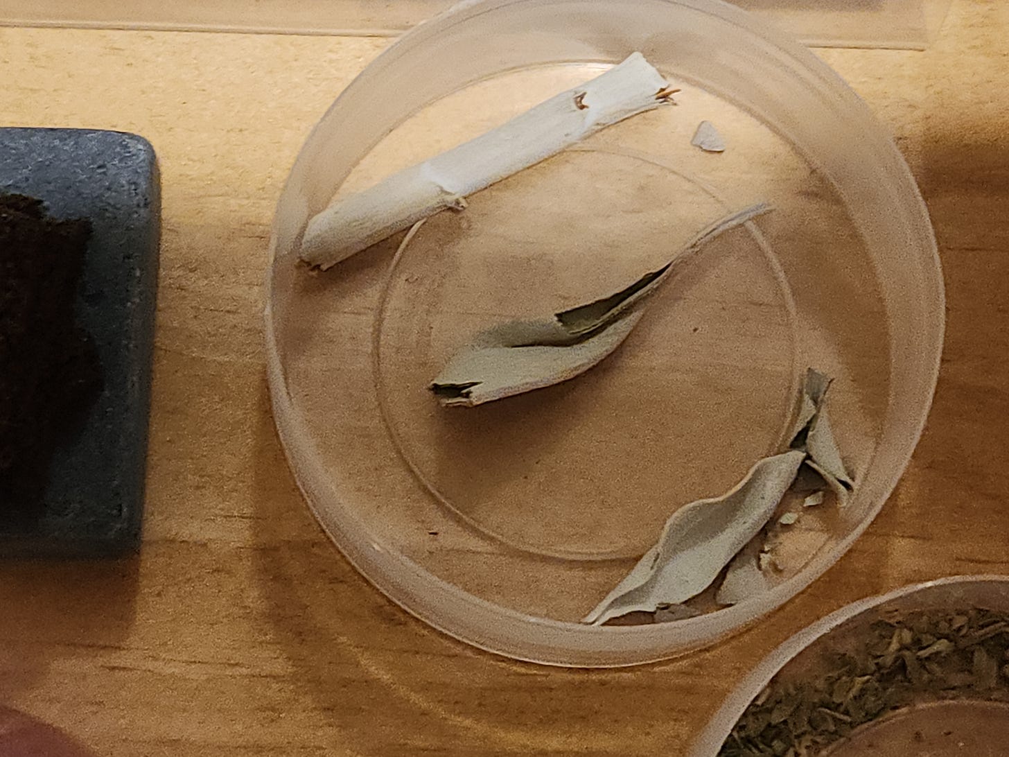 In the first plastic container are a few pieces of white sage.