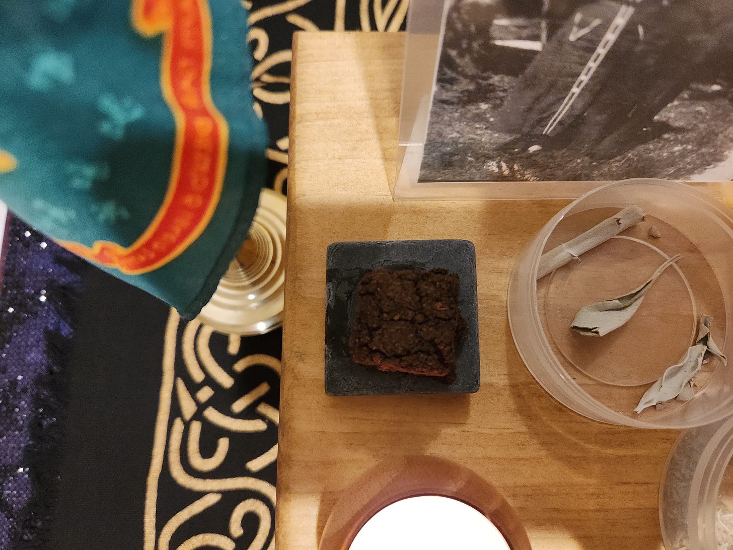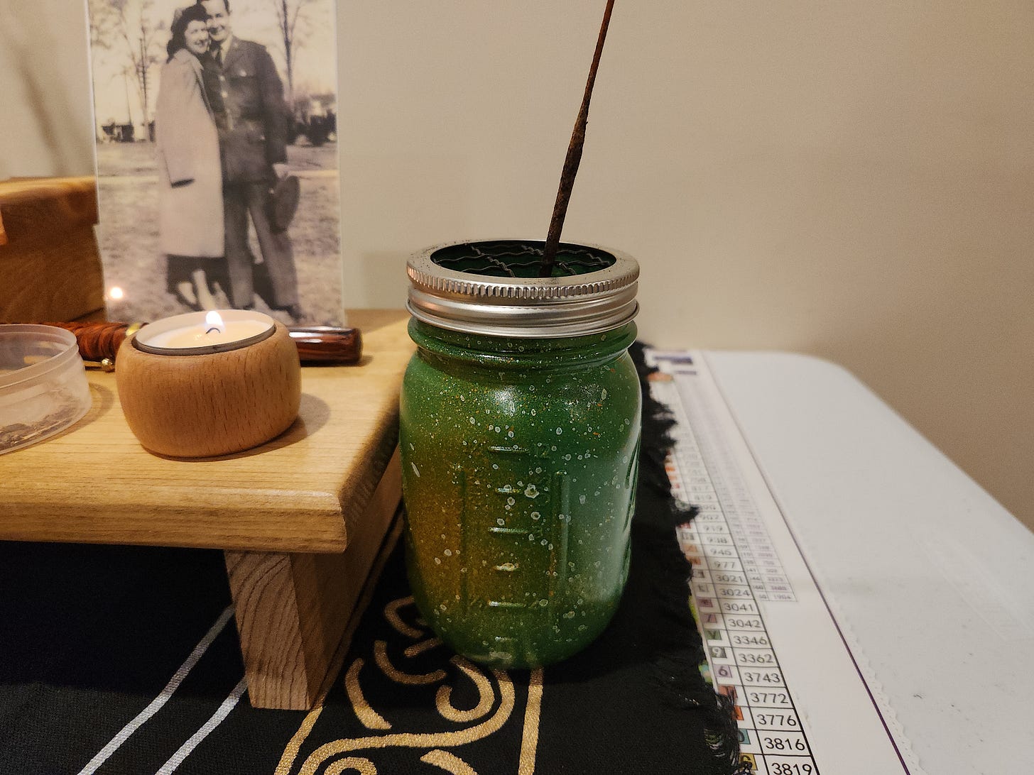 On the table, on the far right, is a mason jar with a turf incense. It is made by grounding up turf (like the piece I previously showed) and then rolling it onto sticks to make incense. I used to have a monthly subscription to receive turf incense. In the below photo, you can also see my great-grandfather’s pen behind the candle.