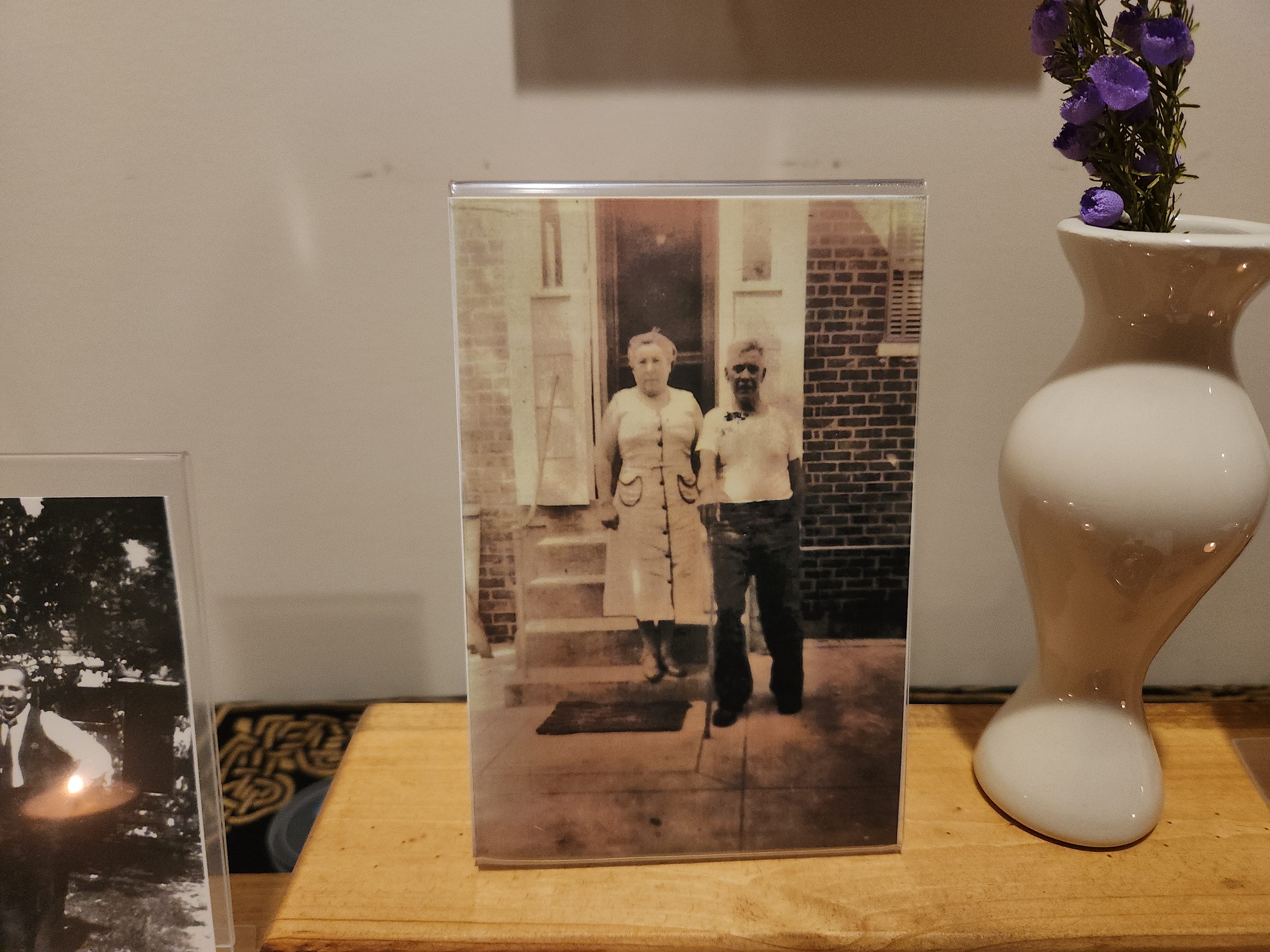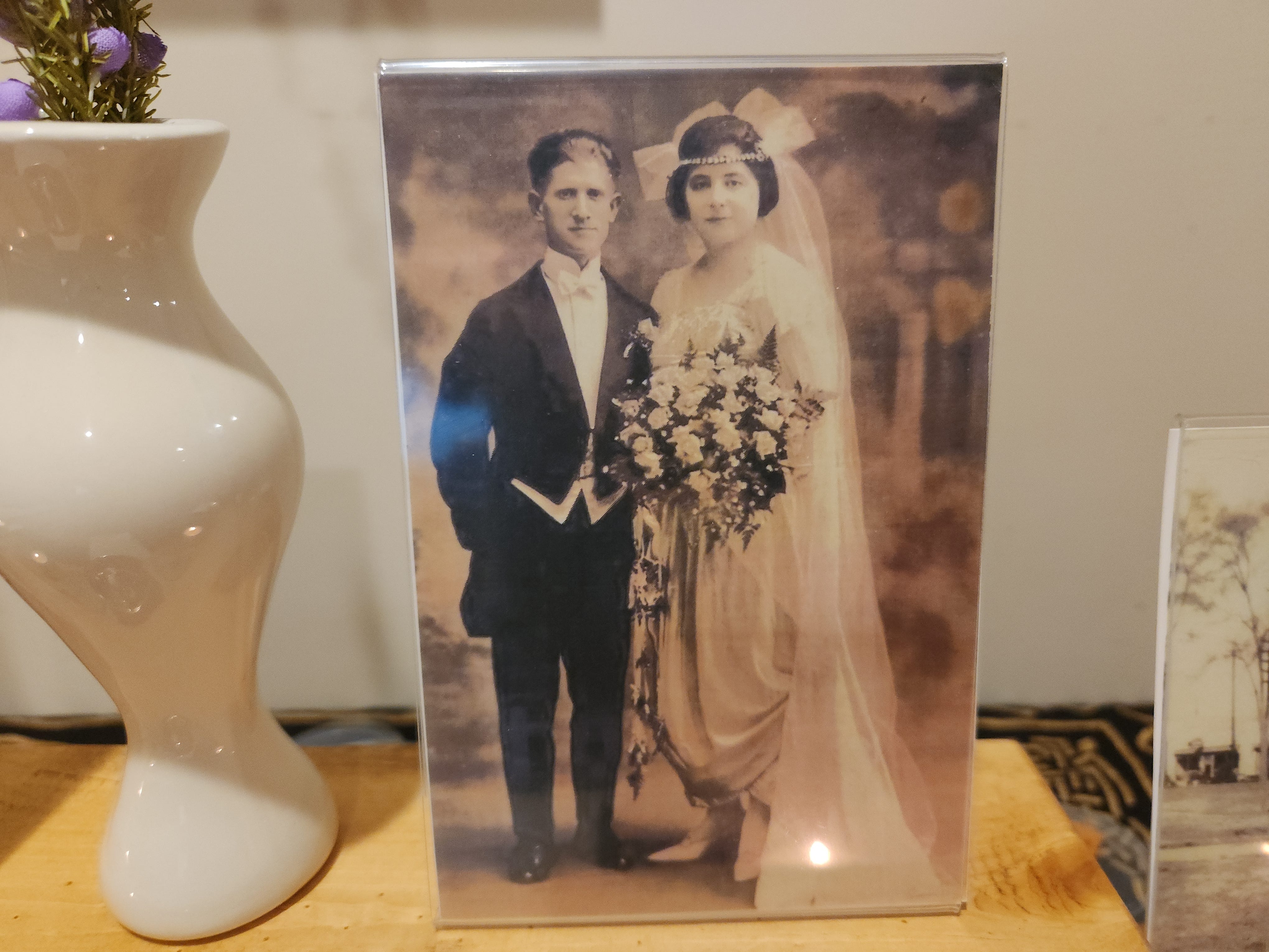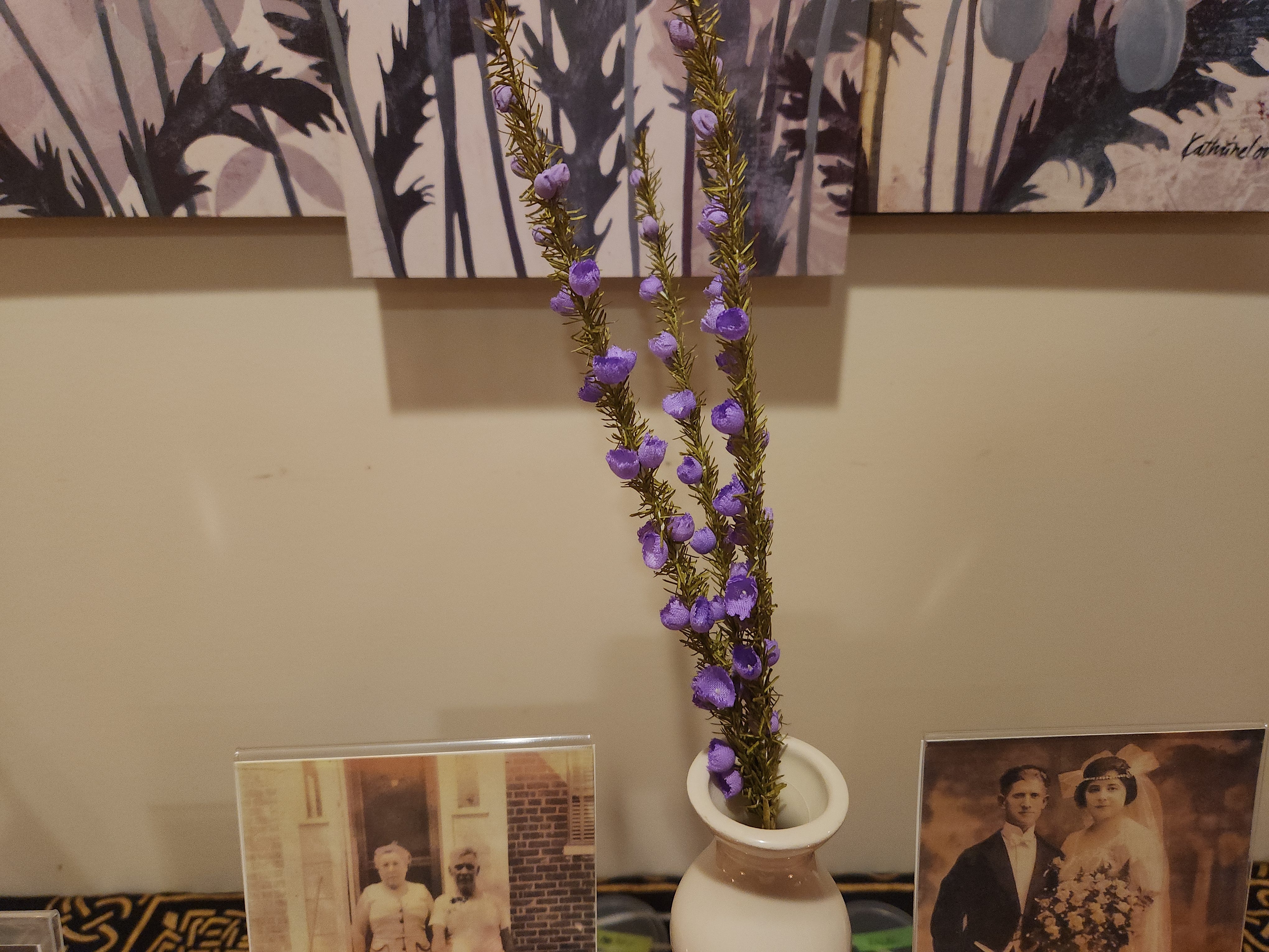 The last two items. On either side of the heather are photos of two sets of my great-grandparents.