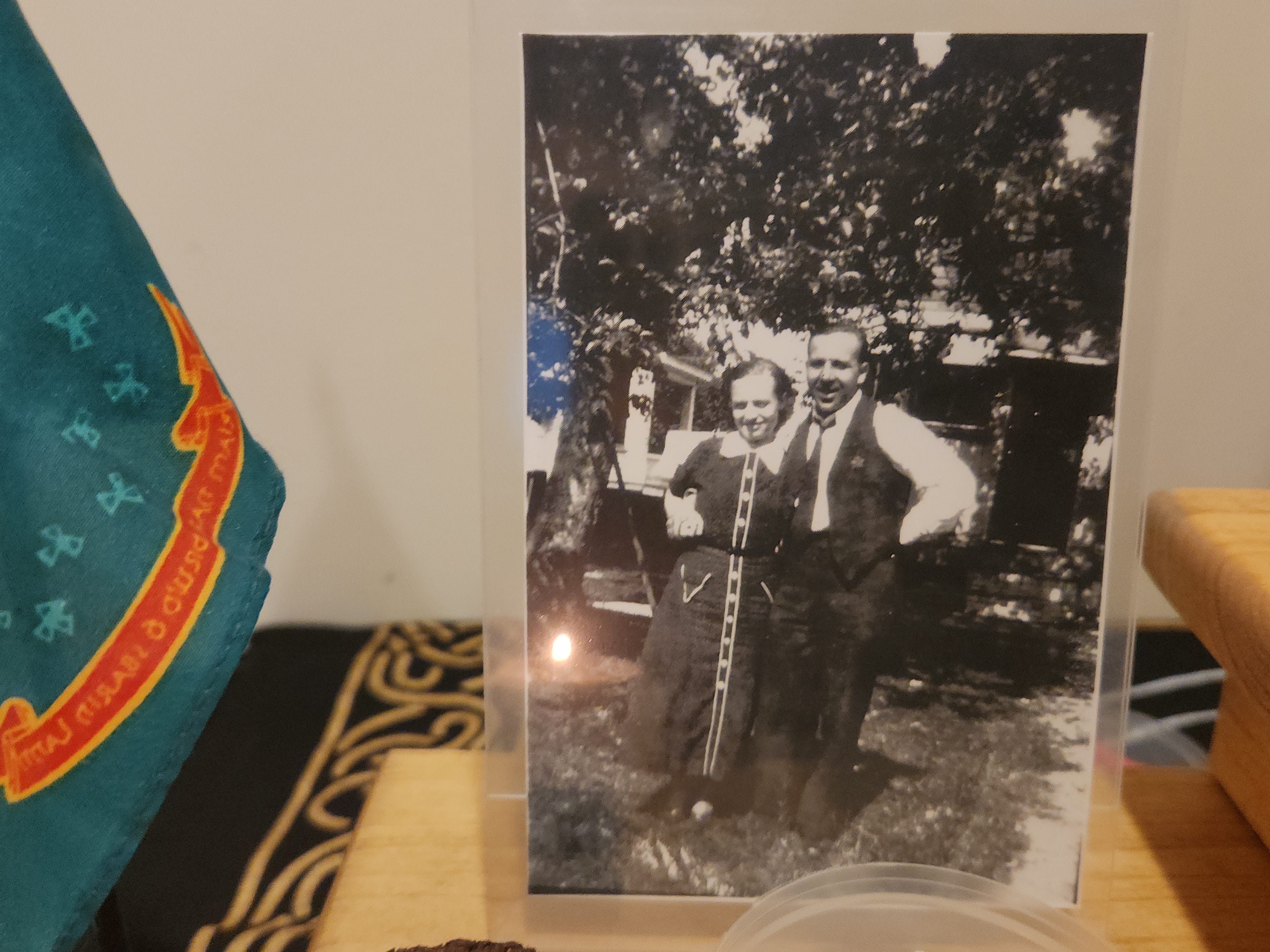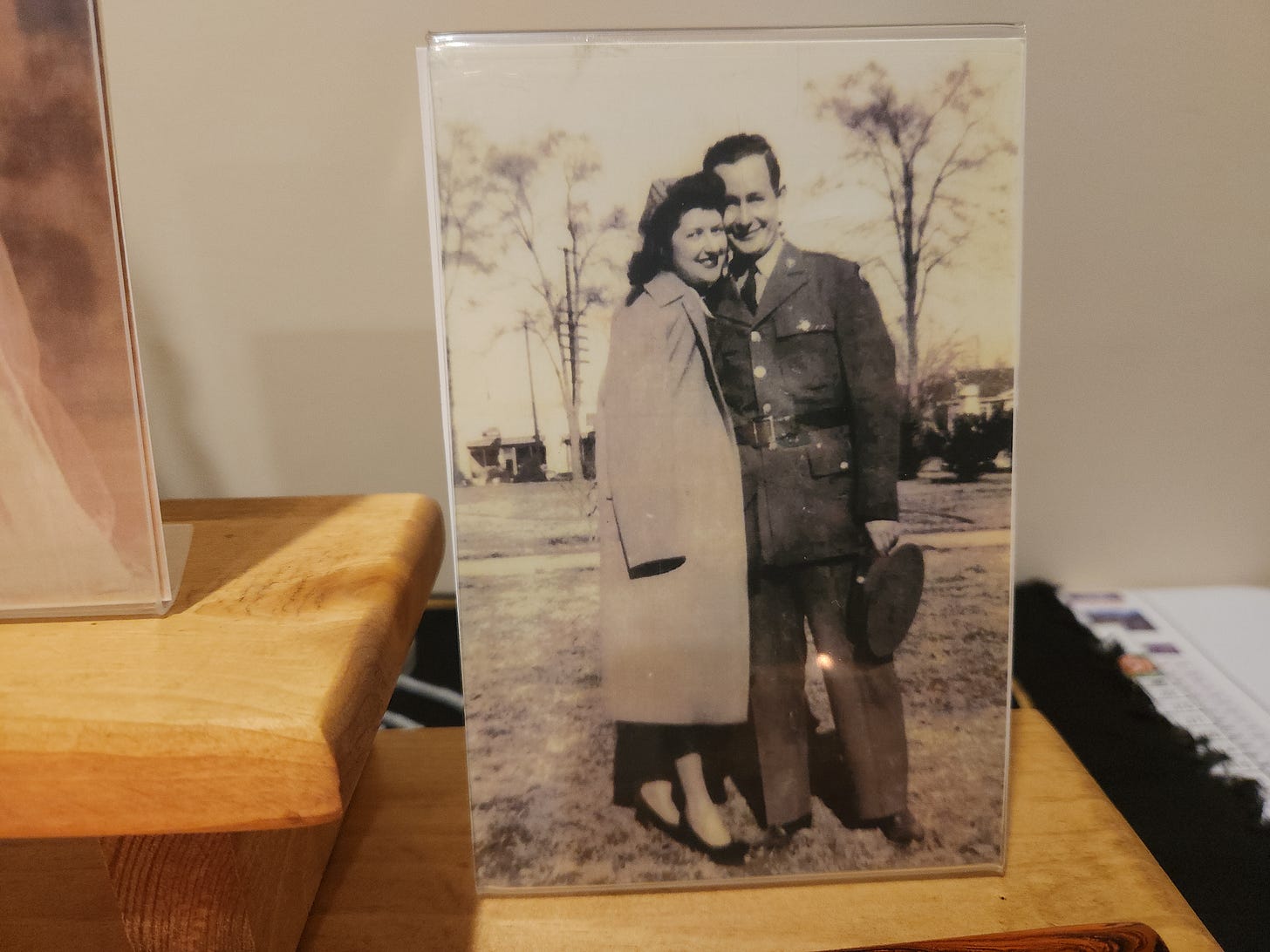 Behind the white oak and the candle on the first level is a photo of my maternal grandparents. This photo was taken shortly before my grandfather left for World War II. He was an Army Air Force medic in the South Pacific.