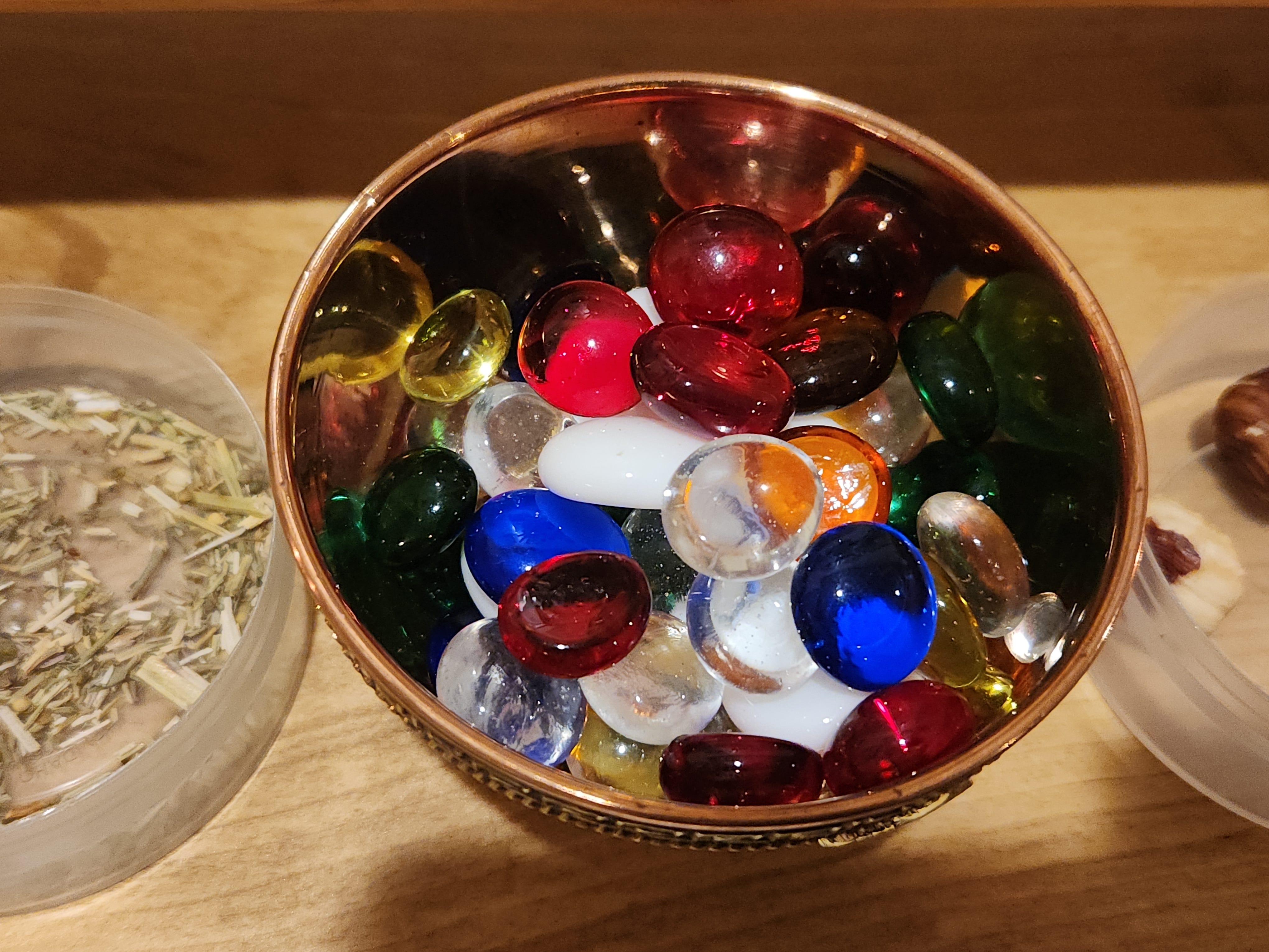 To the right of the fumitory on the first level (center of the first level) is a small offering bowl containing different colored glass beads.